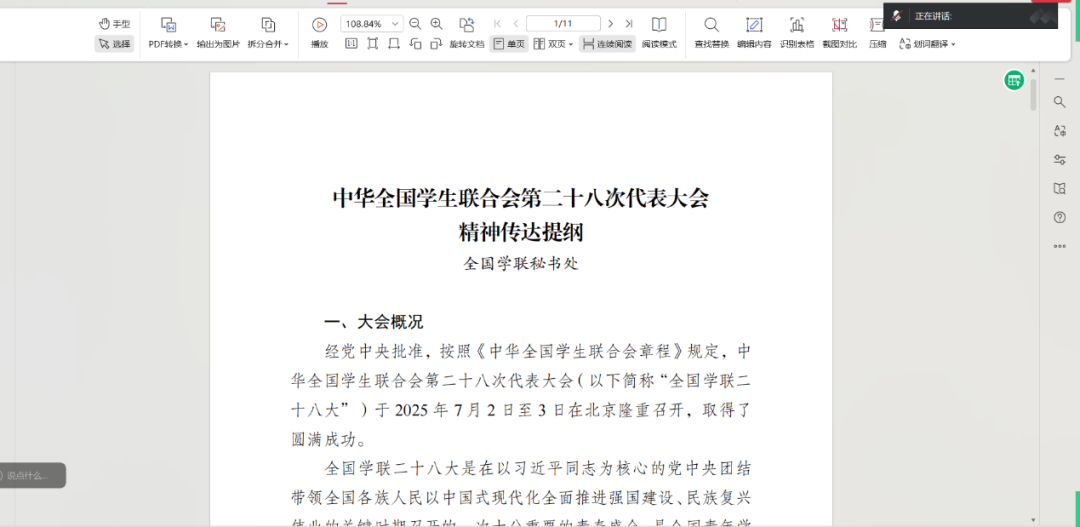 为深入学习贯彻中华全国学生联合会第二十八次代表大会精神,引导团员青年坚定理想信念、勇担时代使命,7月17日18:00,9728太阳集团团学以线上会议形式组织开展专题学习活动,集体学习大会精神传达提纲,并结合社会实践实际展开热烈讨论。